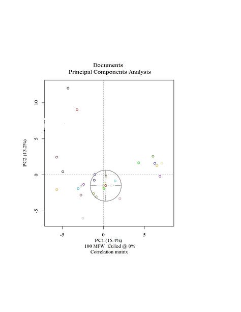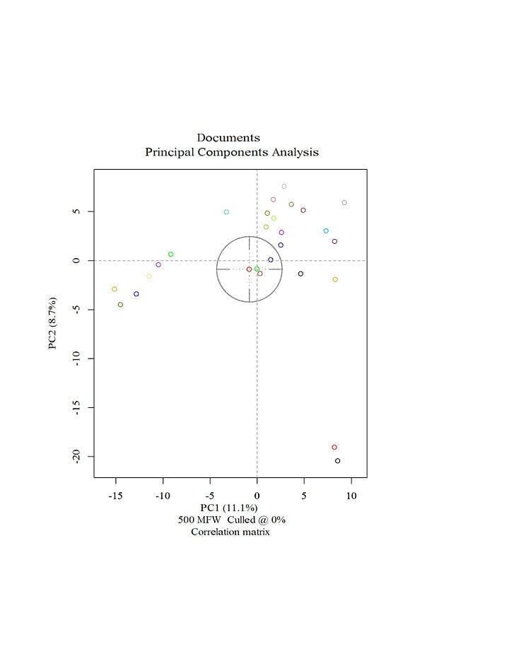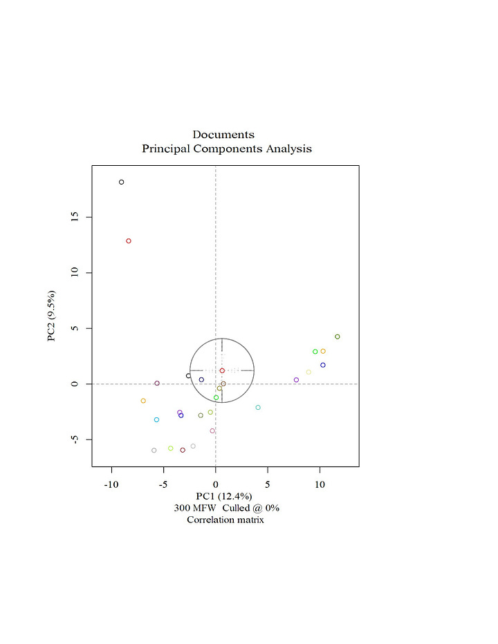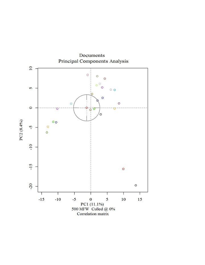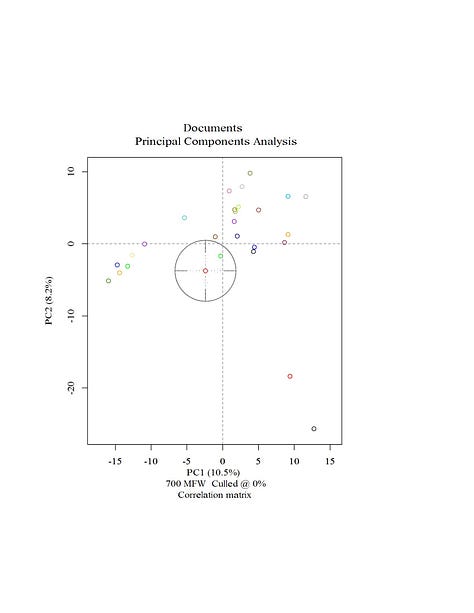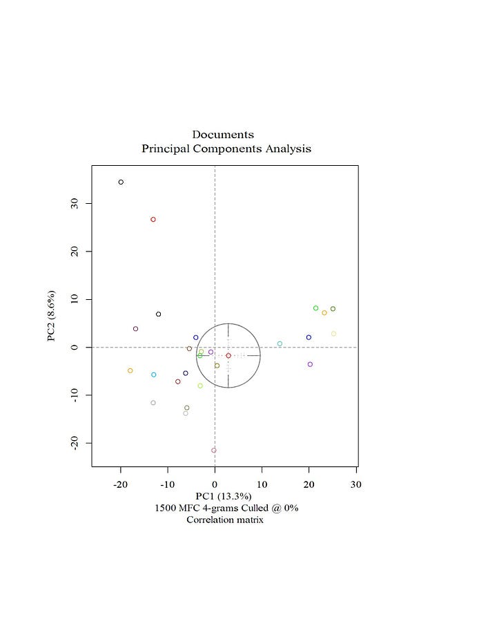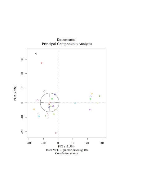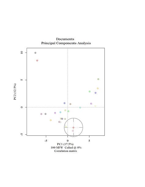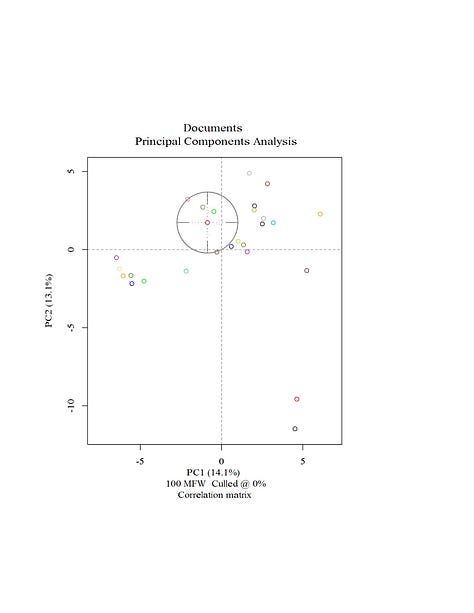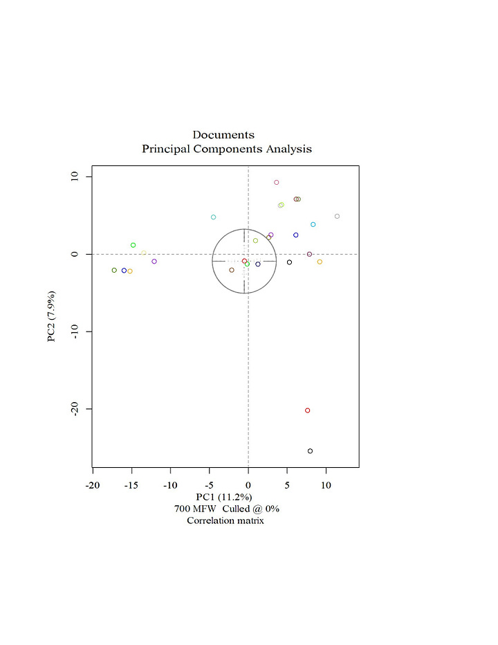To do that, R-stylo recommends that we “sample” each work. We can set it to take a random sample of each work that is the exact length of Balzac’s Letter on Labor, thereby equalizing the length for all works. Then, to get more exposure to the raw data, Eder recommends that we use the Principal Components Analysis graph (13:10).