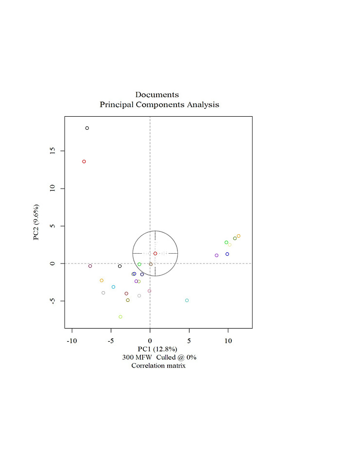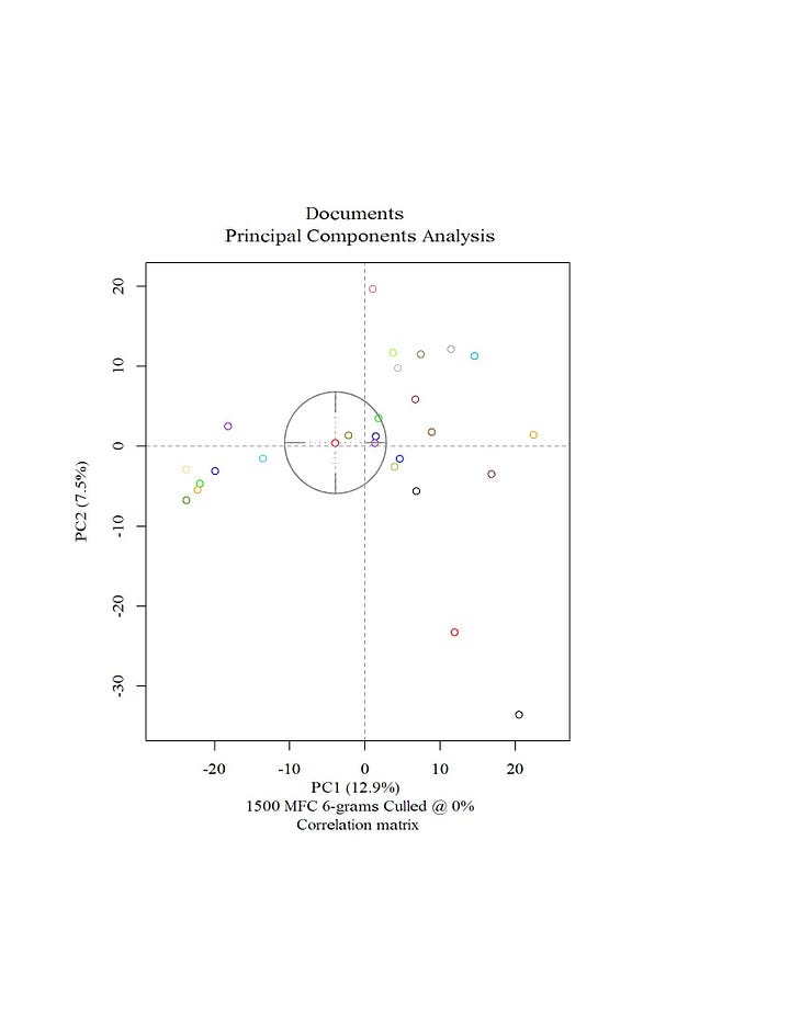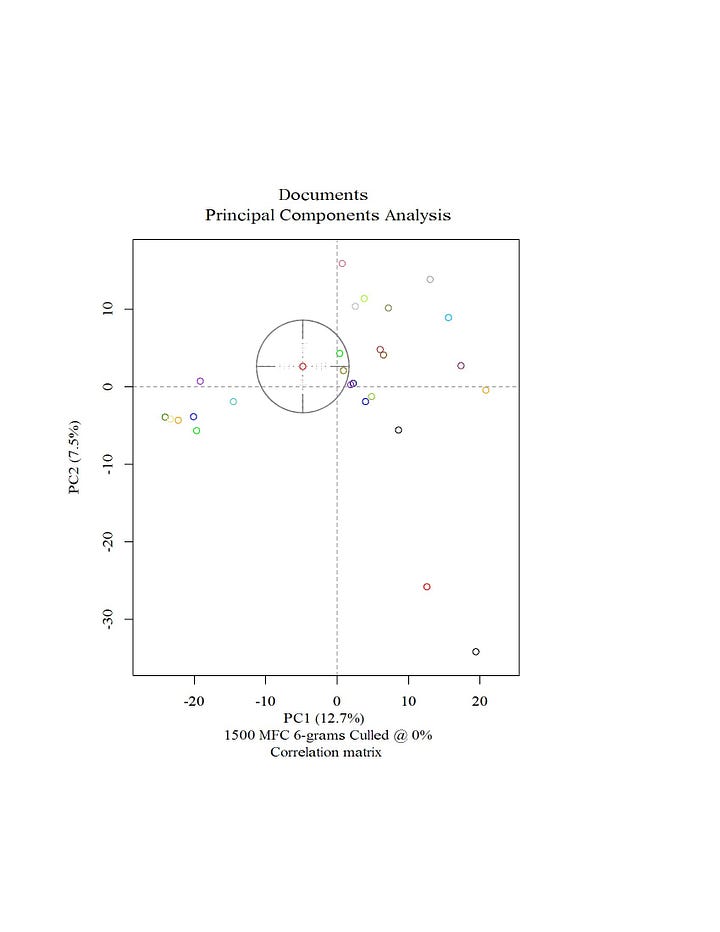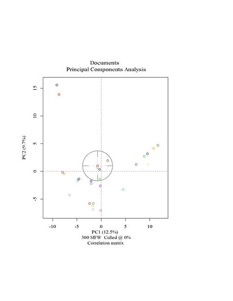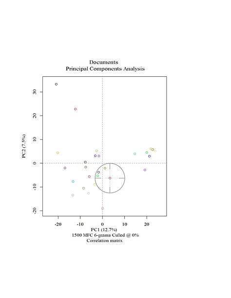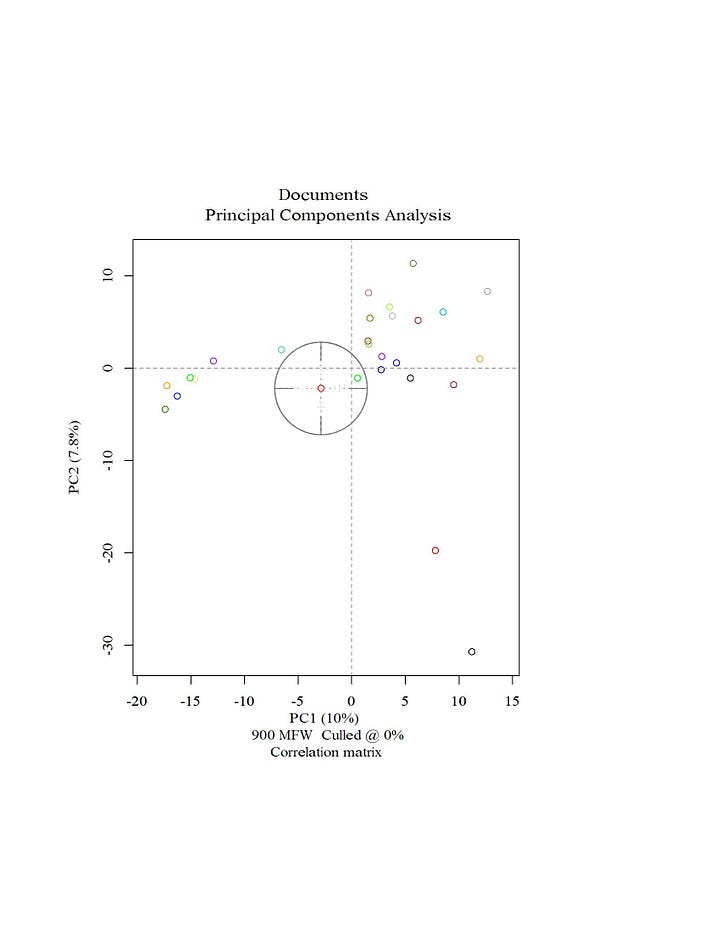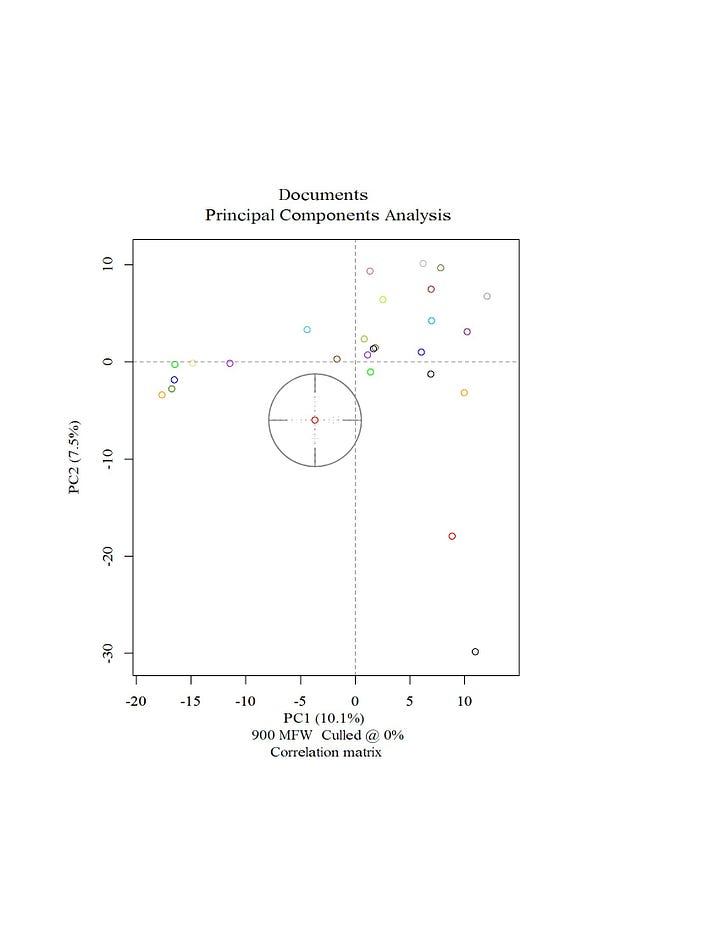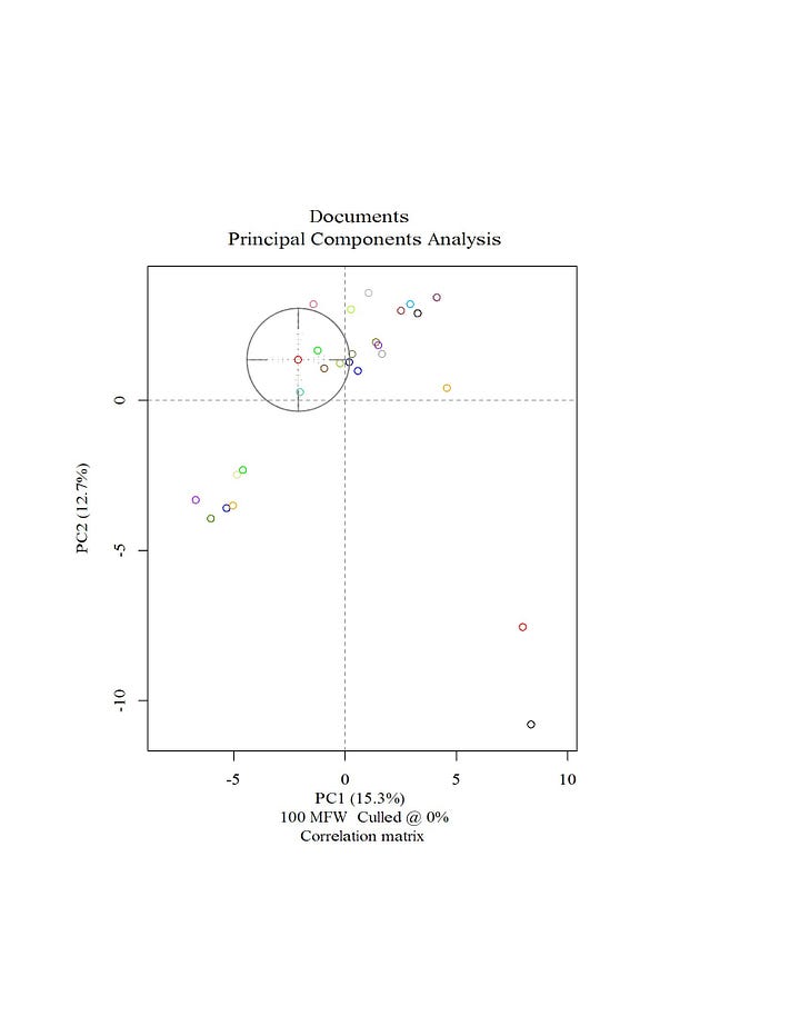 To do that, R-stylo recommends that we “sample” each work. We can set it to take a random sample of each work that is the exact length of Balzac’s Letter on Labor, thereby equalizing the length for all works. Then, to get more exposure to the raw data, Eder recommends that we use the Principal Components Analysis graph (13:10).