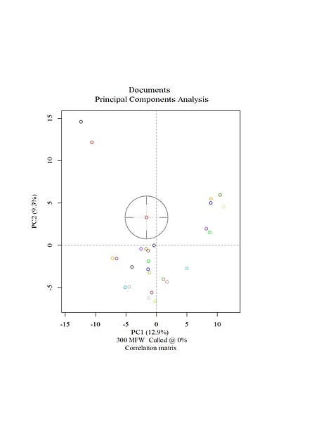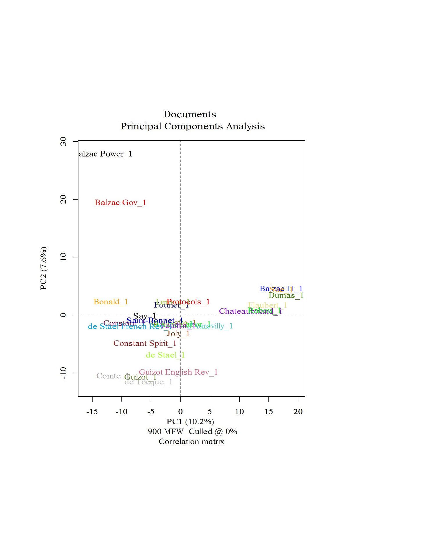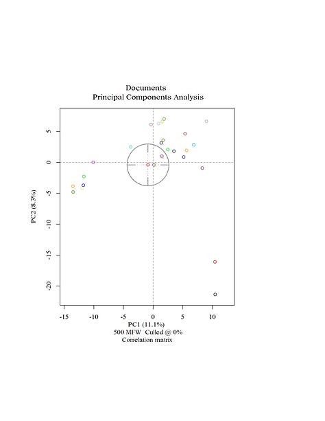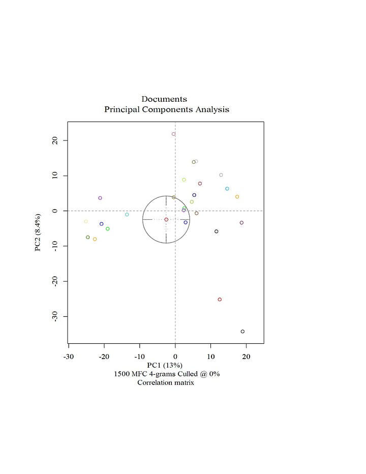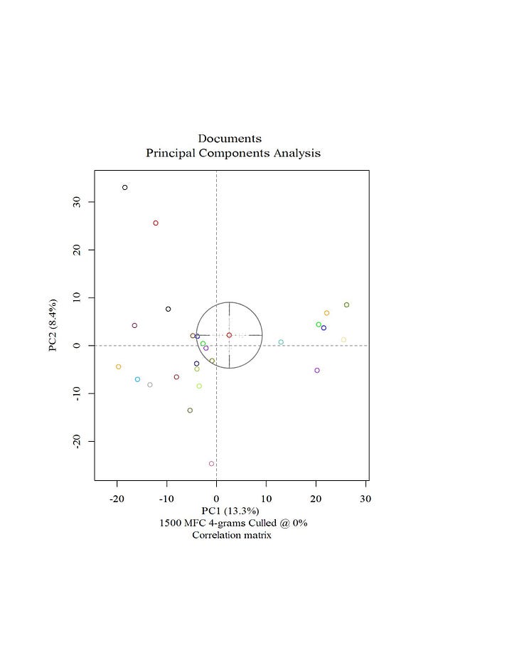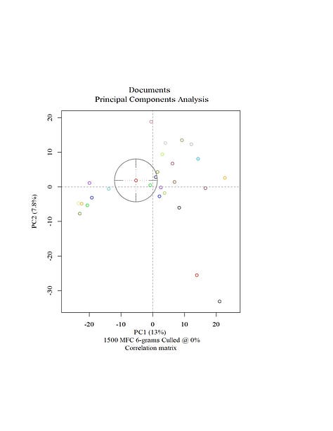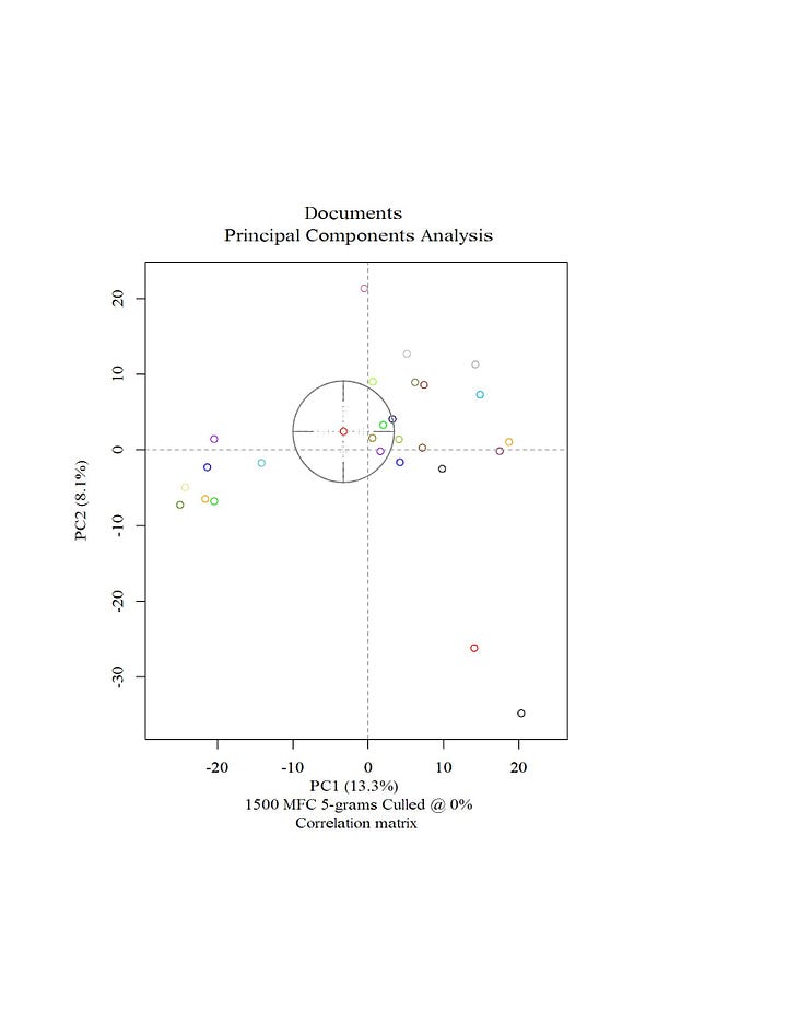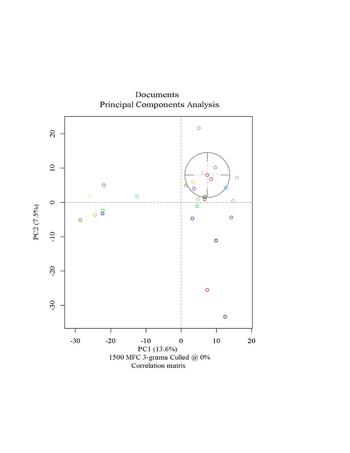 To do that, R-stylo recommends that we “sample” each work. We can set it to take a random sample of each work that is the exact length of Balzac’s Letter on Labor, thereby equalizing the length for all works. Then, to get more exposure to the raw data, Eder recommends that we use the Principal Components Analysis graph (13:10).