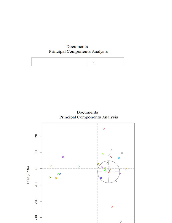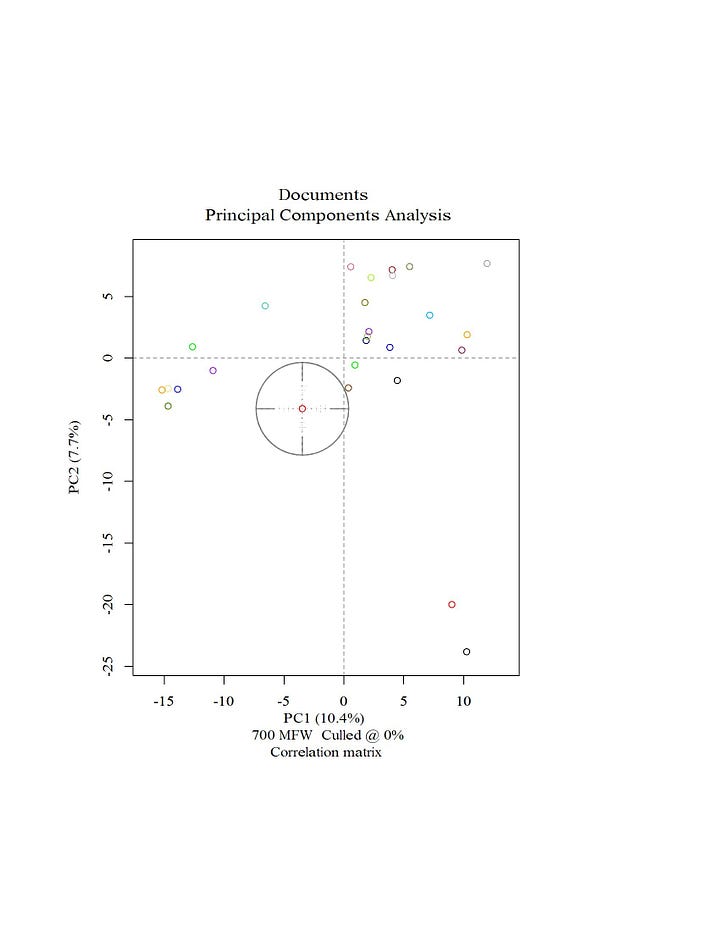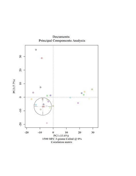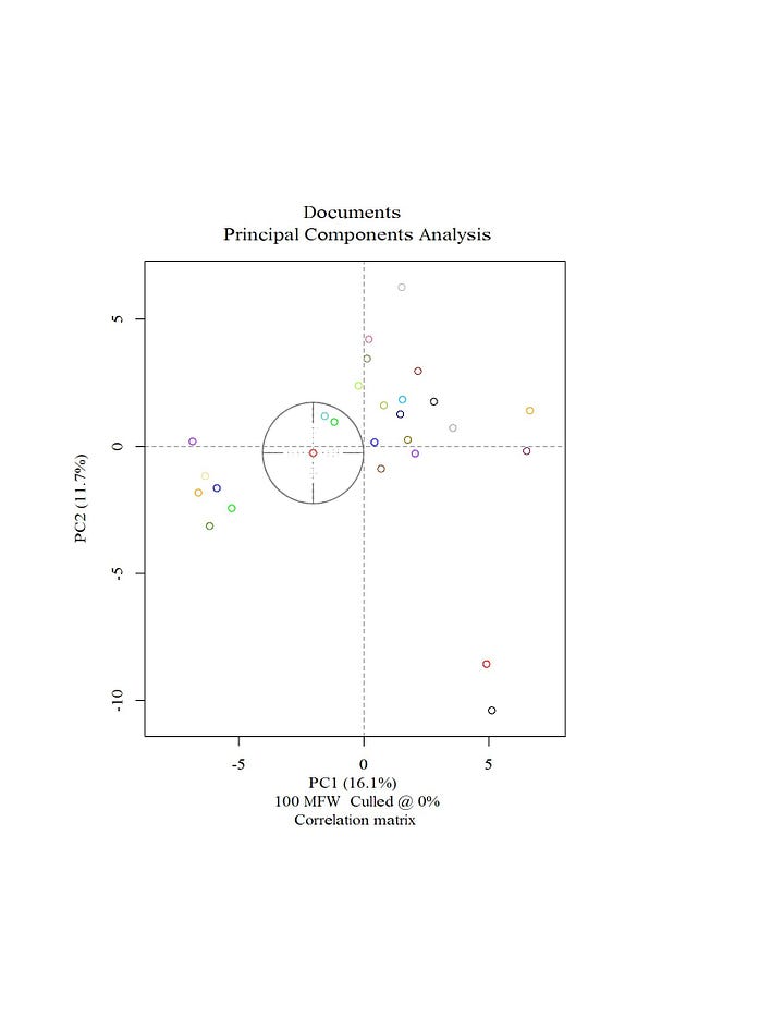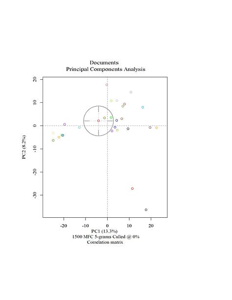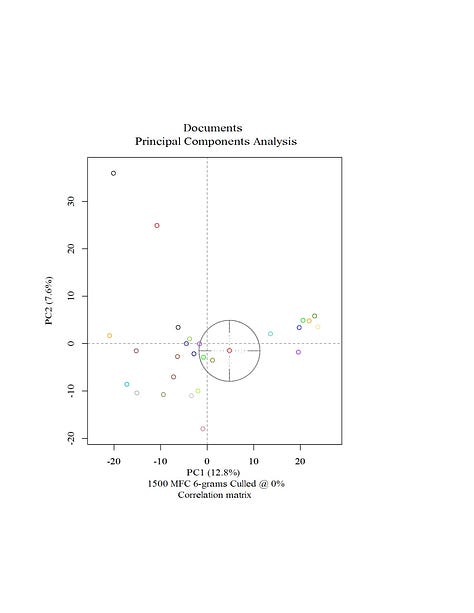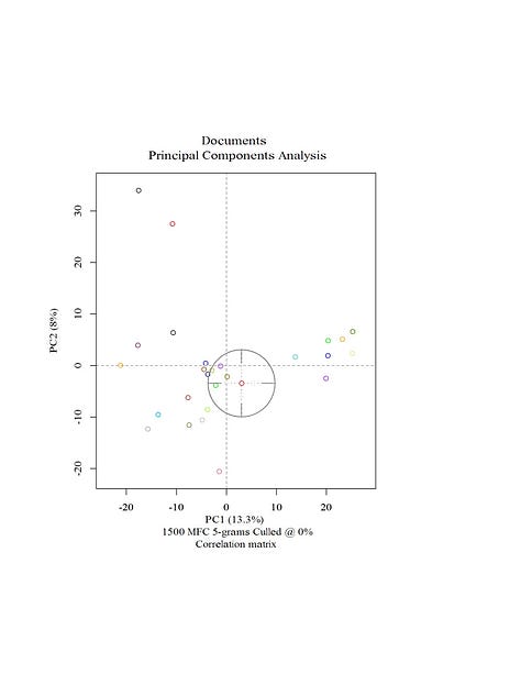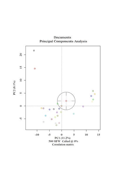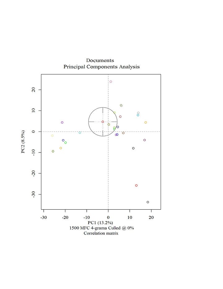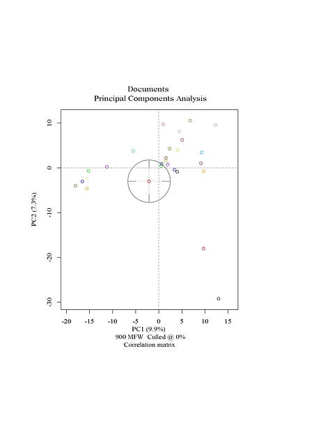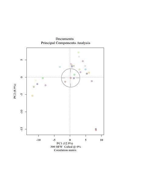 To do that, R-stylo recommends that we “sample” each work. We can set it to take a random sample of each work that is the exact length of Balzac’s Letter on Labor, thereby equalizing the length for all works. Then, to get more exposure to the raw data, Eder recommends that we use the Principal Components Analysis graph (13:10).