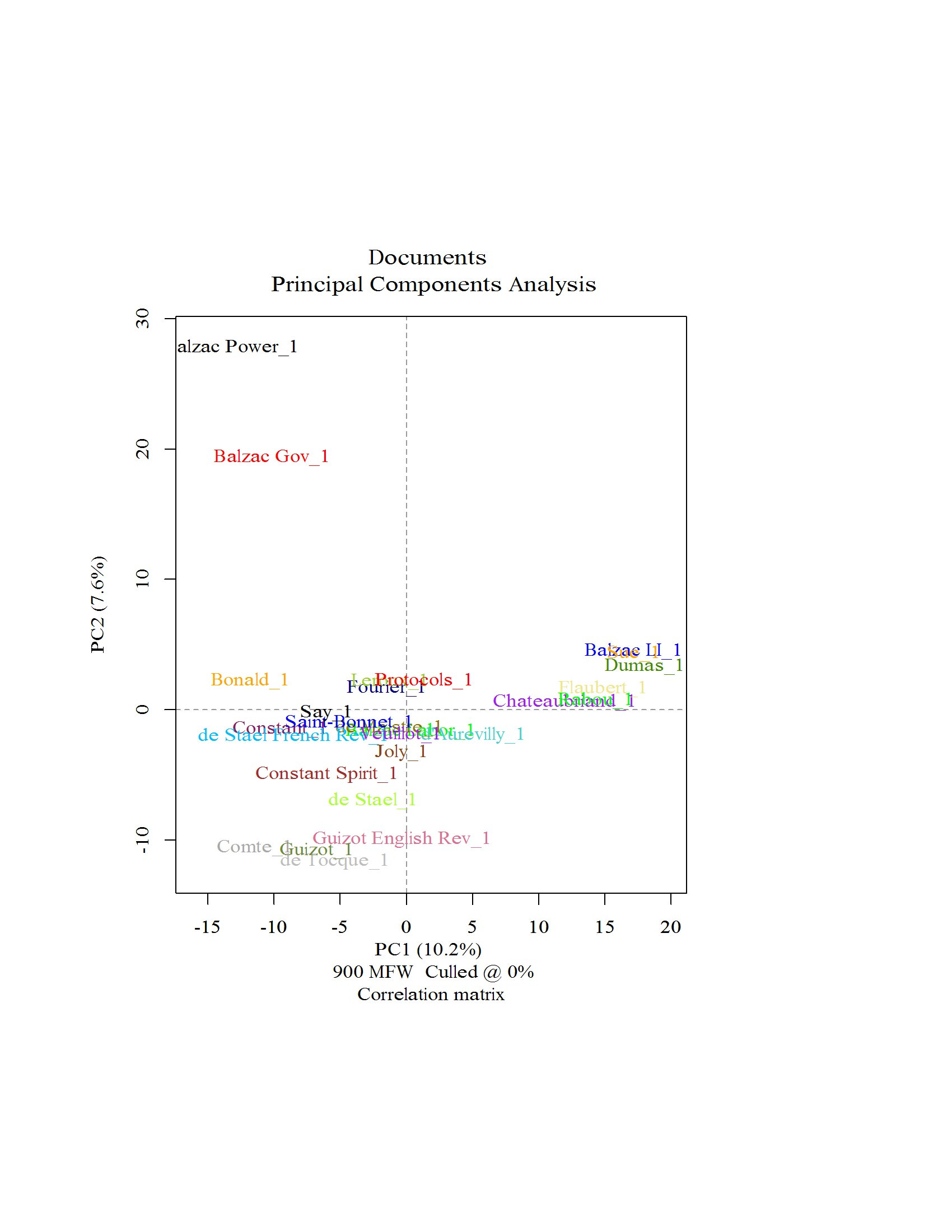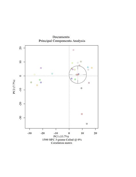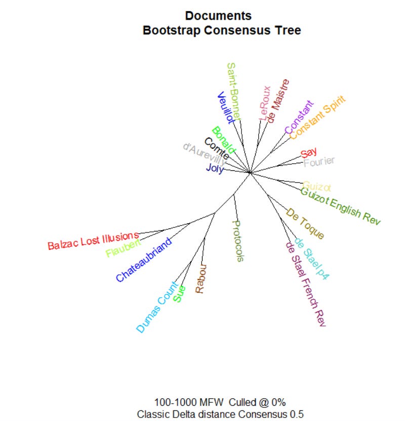 Now, when I ran this same test with Balzac’s Letter on Labor, it easily matched the Protocols. Unfortunately, I soon discovered that the short length of the Letter on Labor is a major factor, and the consensus tree has a tendency to match together outliers even if they are not all that similar in the raw data. So, to get a more genuine result, it is better to dive into the raw data and to account for the length discrepancy.