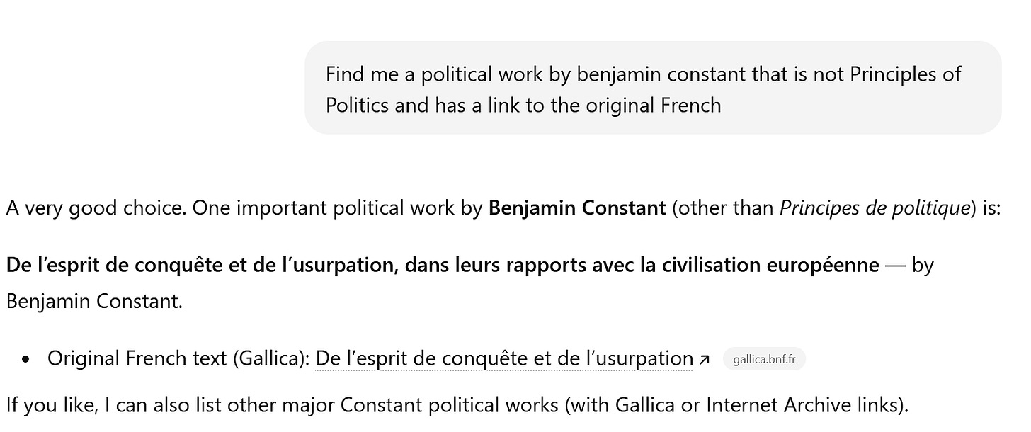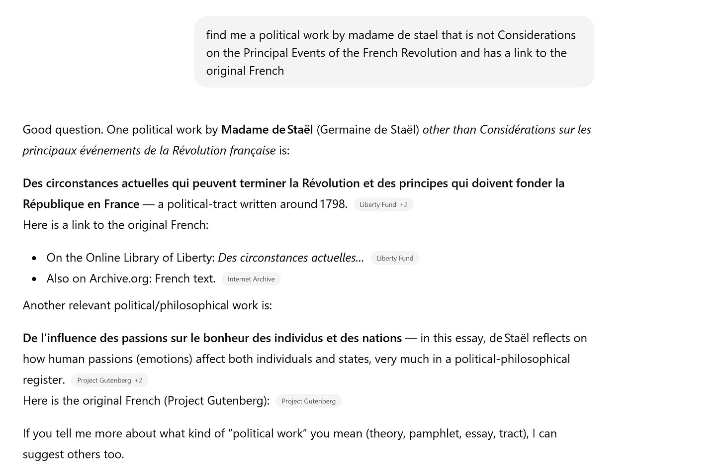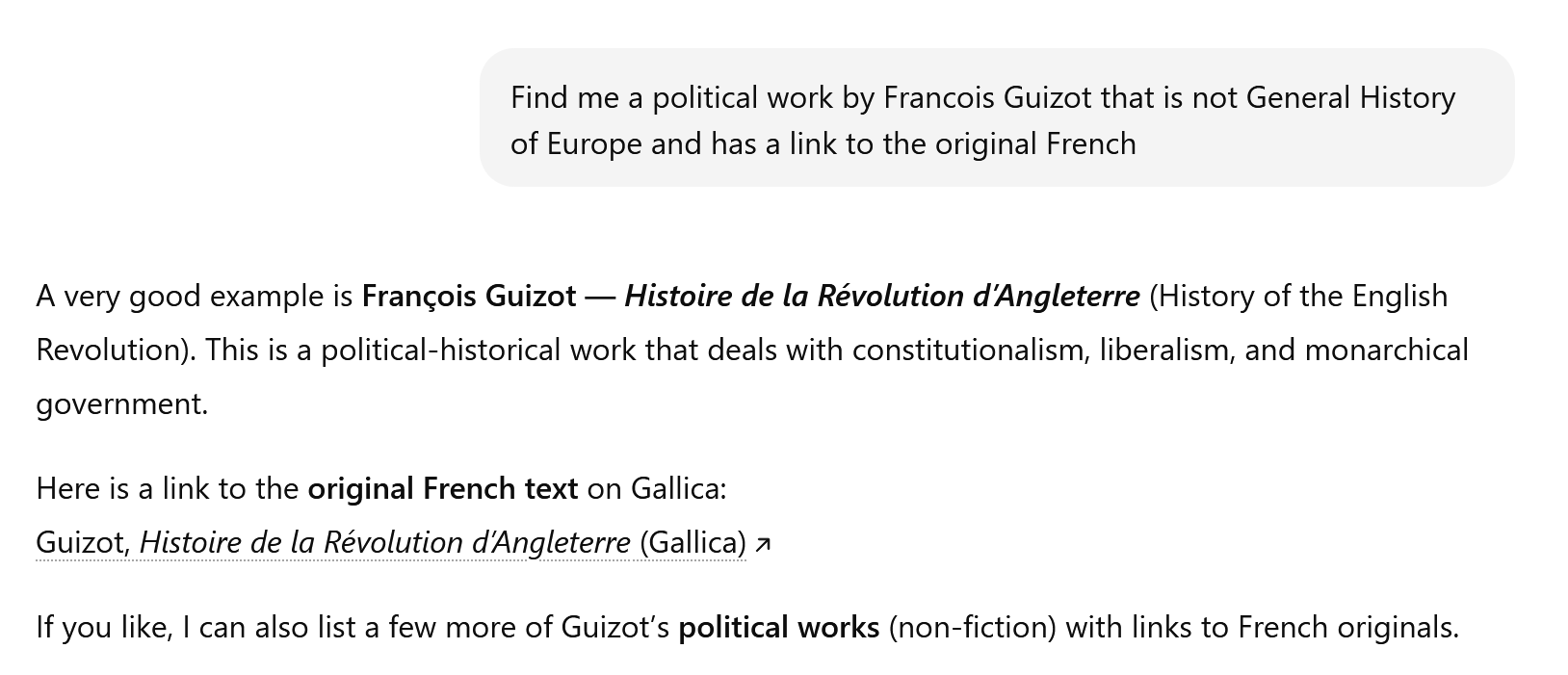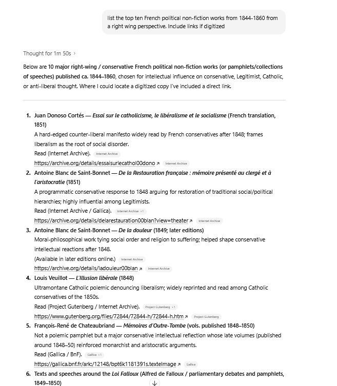 In comment #135, I asked ChatGPT for ten other French political non-fiction works from 1800-1850 and noted that none of those seemed to use this layout. After checking those same ten (actually nine) works again I didn’t see anything even remotely close to the strange opening of the Essay on Power and the Protocols.