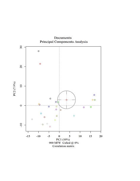 We can’t run a consensus analysis with the PCA graph, so let’s run five tests at each of 100, 300, 500, 700 and 900 MFW. The Protocols is represented by the red dot, and I have overlain a target on to it. The neon green in the non-fiction cluster is Balzac’s Letter on Labor. This analysis was easiest to run with dots, and I’ll summarize the results at the end if you don’t want to look at 25 graphs, but I’ll also post one example that shows the titles and color-coding for all of them, if you’re curious: