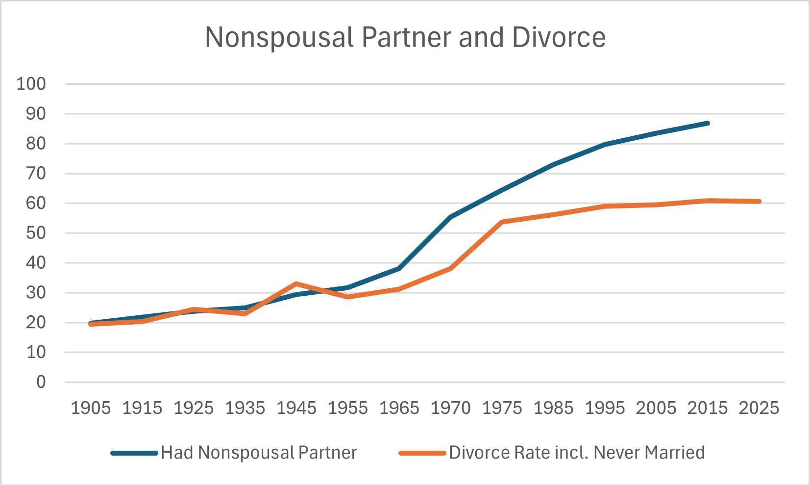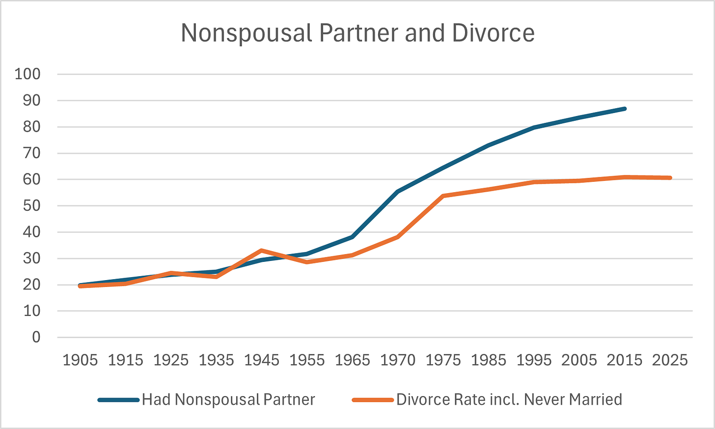 All together, I graphed this data to compare the trends in having had a nonspousal partner alongside the adjusted divorce rate.1