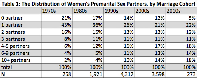 It’s also possible that the damaging effect of nonspousal partners is reduced if spread out over a longer period of time. Someone who sleeps with three people at 19 and then gets married at 20 is probably going to be more damaged than someone who has slept with three people over ten years and then gets married at 28.