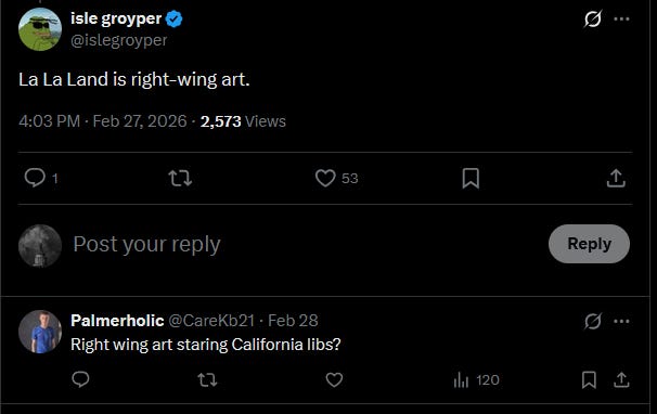 It would probably be inaccurate to call La La Land “right-wing art” though, as one of the commenters on that clip did.