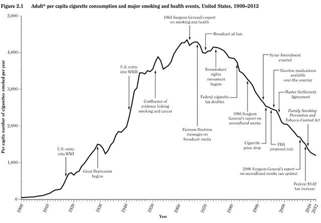 Surgeon General reports the damaging effects of smoking, beginning a government led-effort against smoking.