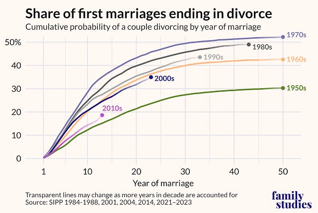 As you can see, while there has been a substantial decline in the crude divorce rate, this effect vanishes after factoring in those who never marry. We in fact see that the adjusted rate is near a record high, having increased from around 55% in 1985 to around 60% by 2025.
