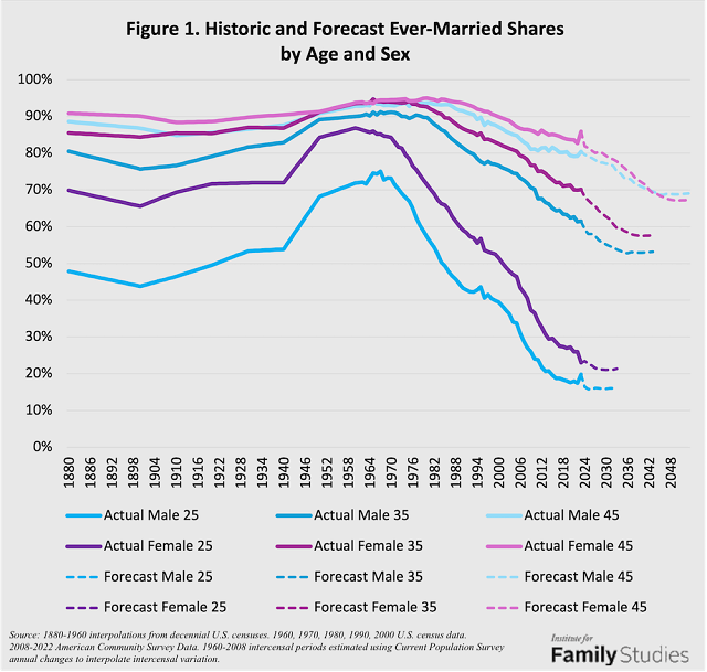 In other words, a 25 year old woman looking for a lifelong spouse in 1910 was almost certain to find one. In 2025, she most likely will end up either divorced or unmarried.