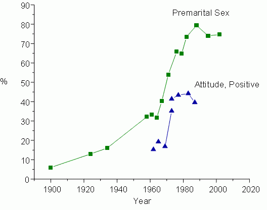 Therefore, it’s very likely that the increase in the divorce rate does reflect a genuine weakening in marital unions. The 20th century was a time of upheaval, and there could have been many potential influences that drove the weakening. One of the most well known changes in relationships during this time though was the sexual revolution. As with divorce, premarital sex also gradually increased throughout the first half of the century, and then spiked shortly before a spike in the divorce rate followed.