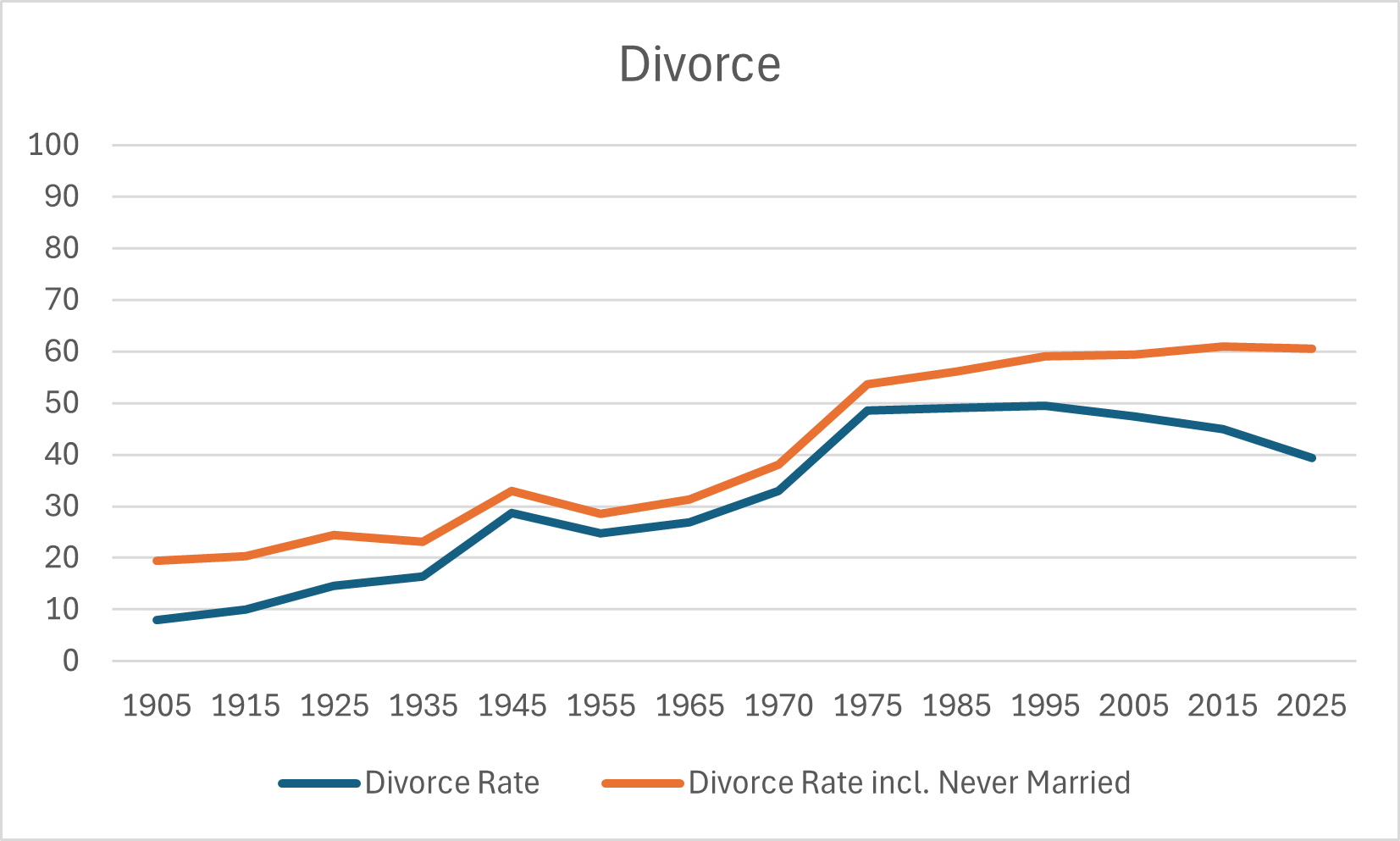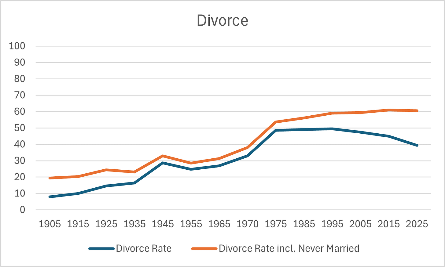 The best way to account for the rise in unmarried women is by adding the percent of women who will remain unmarried at 40 to the percent of women getting divorced. To do so, I took the middle of the percentage of women who were still unmarried at 35 and 45 for a particular year and added that in for the year that they were 25. For example, 19% of 40 year old women were never married in 1995, and I added that to the divorce percentage for 1970.